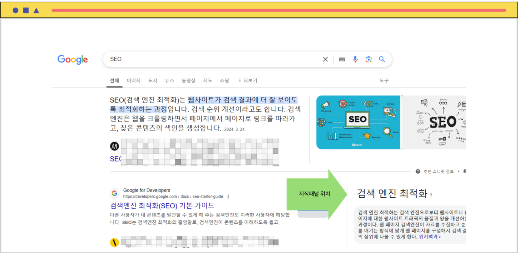 지식패널은 특정 주제나 인물에 대한 핵심 정보를 제공하는 섹션으로, 일반적으로 검색 결과 페이지의 오른쪽에 표시됩니다. 이 패널은 위키피디아와 같이 구글이 신뢰할 수 있다고 판단한 출처의 정보를 기반으로 데이터를 가져오며, 사용자들이 원하는 정보를 빠르고 직접적으로 얻을 수 있도록 돕습니다. 기업이나 브랜드가 지식패널에 노출되면 기업의 신뢰도에도 긍정적인 영향을 줄 수 있습니다.