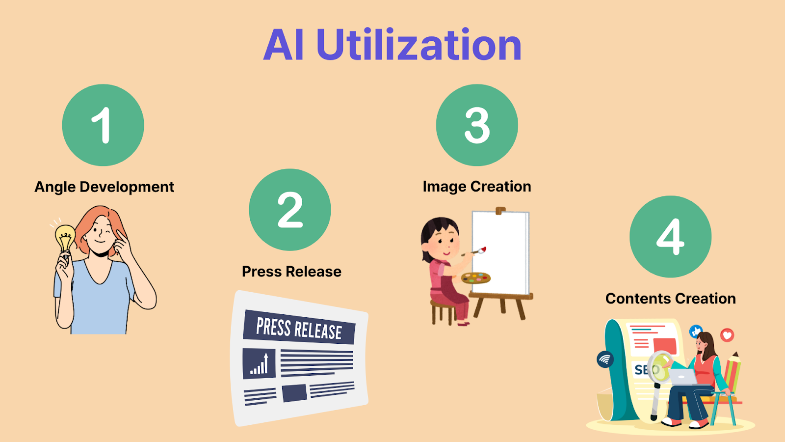 이처럼 PR 업무에서 AI는 이미 단순한 효율성의 도구를 넘어 핵심 구성요소라고 해도 과언이 아닌데요. 실제로 앵글 발굴, 보도자료 초안 작성, 배포용 이미지 생성, 소셜 미디어 콘텐츠 제작 등의 실무에서 AI를 활용해 업무 효율을 높일 수 있습니다.