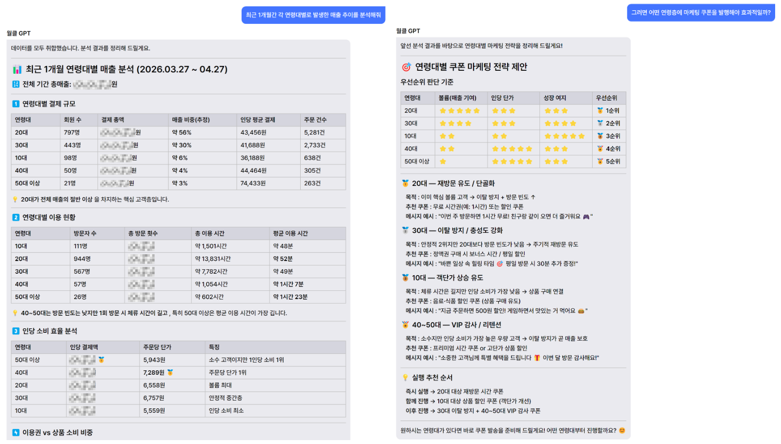 ‘월클 GPT’의 주요 특징은 ‘마케팅 연계 기능’과 ‘레포트 기능’이다. 우선 ‘마케팅 연계 기능’은 데이터 분석 결과를 바탕으로 즉시 쿠폰을 발행할 수 있는 기능이다. 예를 들어 “최근 1개월간 연령대별 매출 추이를 분석해 달라”는 질문에 대해 월클 GPT는 매장 내 데이터를 기반으로 분석 결과를 제시한다. 이어 “어떤 연령층에 마케팅을 진행하는 것이 효과적인가”와 같은 추가 질의 시, 연령대별 마케팅 우선순위를 도출하고 해당 타겟에 맞는 쿠폰 발행까지 연계할 수 있다.